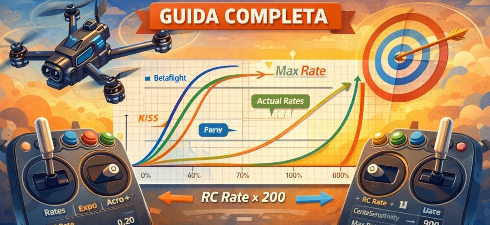 1. Cos’è un “rate” I rates definiscono quanto velocemente il drone ruota in gradi al secondo (deg/s) quando muovi lo stick. Tre elementi principali controllano la curva di risposta dello stick: Sensibilità al centro (quanto reagisce vicino allo stick center) Velocità massima di rotazione Expo (quanto la curva è morbida al centro) Ogni firmware usa […]